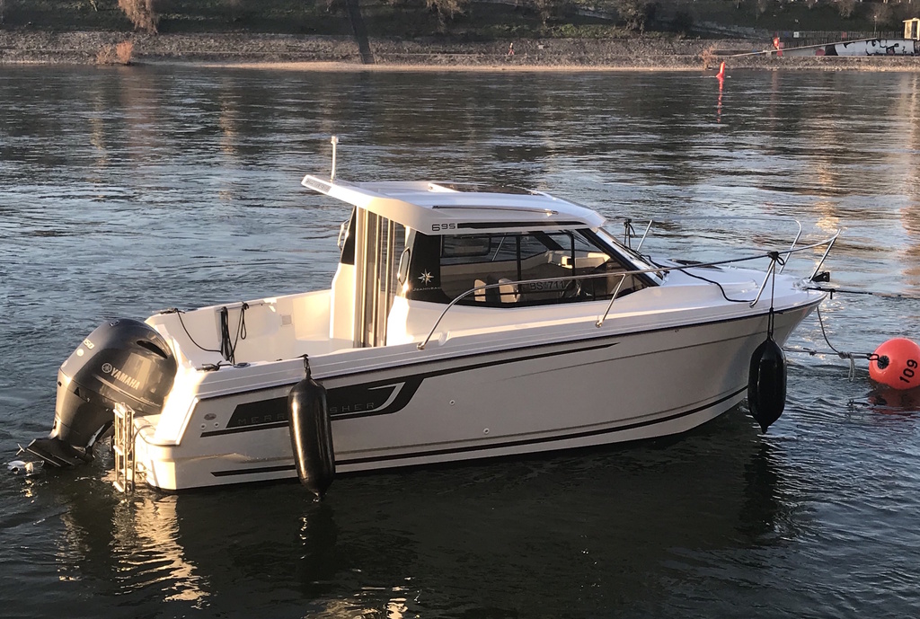 Modernstes Fahrschulboot mit 150 Ps. Außenborder und elektronischer Schaltkreis, und sogar Kaffeemaschine und Kühlschrank ist an Bord.